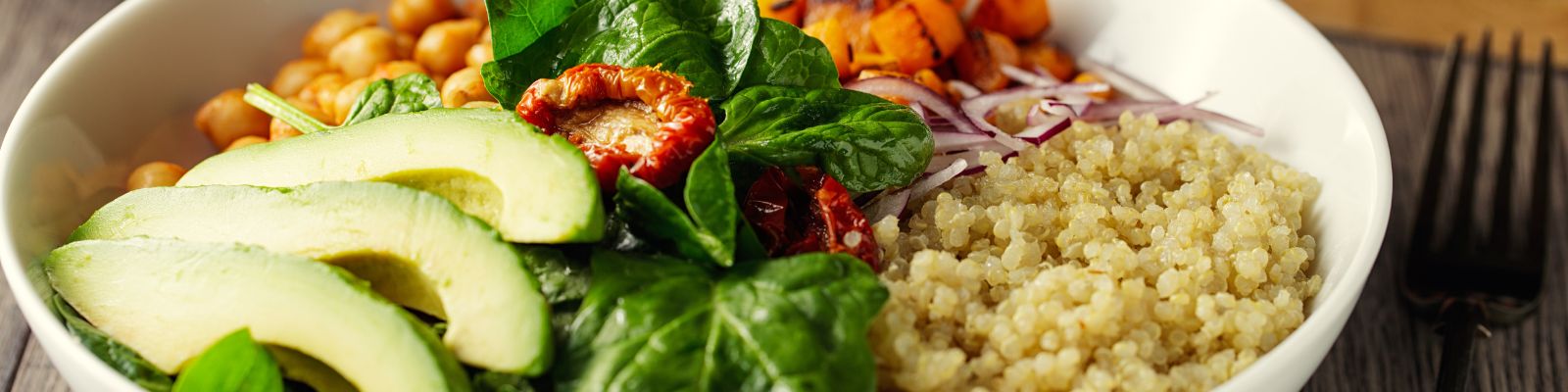 - Place the cooked quinoa at the base of a bowl. Add a spoonful of sauerkraut and beetroot hummus to the center.